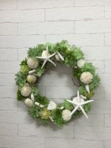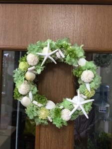 グリーンがお好きな方なので 季節的にも爽やかな貝殻とグリーンのアジサイ・ソーラーフラワーのマムとローズ。アイスランドモスの薄い色のグリーンを土台に敷きつめ、その上に アジサイ等々 バランスをみながら 配置していきました。最後にヒトデをあしらって完成です。