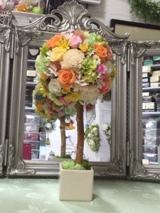 オレンジ色のプリザーブドフラワーをポイントに明るい感じに仕上げました。支柱は白樺の枝を使用。