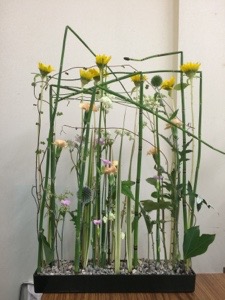 ヒマワリで8:5:3で まずポジションを決め、花の種類で段付けをしていきます。今日は装飾的なので 下から15センチは 葉も落とし、すっきりさせます。