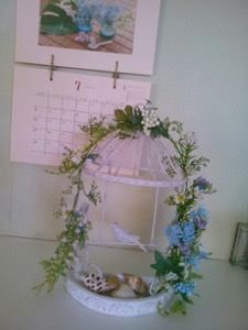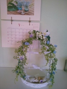 春にフレッシュのお花で 鳥かごを使って アレンジした土台の鳥かごにアーティフィシャルでアレンジいたしました。