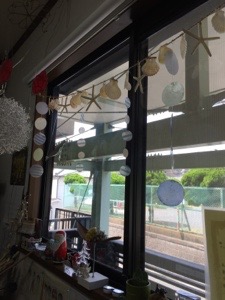 趣味のステンドグラスで作ったクジラと貝殻とヒトデのガーランド 昨日覗いた100円雑貨のお店ナチュラルキッチンで見つけたカピスのガーランドを飾り付けました。