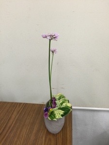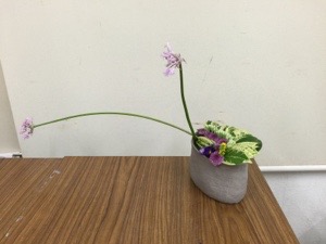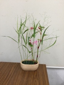 なかなか 難しく 私は椿の葉が斑入りとグリーンがありましたので この葉をシュトュルクトュワーで表現をしてみました。そこにミニマム等々小さな花で平面構成。リコリスを飛ばして 流れをだしてみました。もう一つは風知草のデザインです。