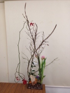 私はニシキギを器に合わせて 三角のラインを作り、そこに花を入れていきました。エコということで 花留めは 石・枝を使って 留めてあります。