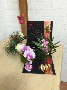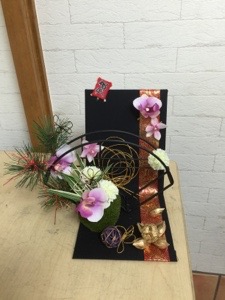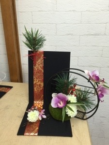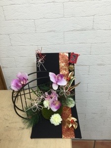 厚紙に黒い布を貼り、屏風仕立てにし、アイアンのマルイスタンドにこけ石を置き、松・笹・コチョウラン・シンビジューム等々でアレンジ。