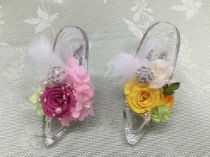 あとお二人は シンデレラのガラスの靴の器に プリザーブドフラワーをアレンジ致しました。お二人ともキラキラしているものがお好きなので 最後に大きなダイヤモンドのオーナメントでオシャレをしました。