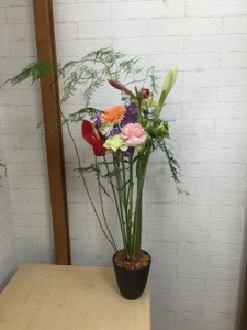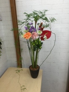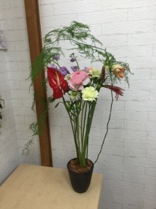 高く位置に花を集め、花束のようにいける。そしてアスパラガスペラで曲線の動きをプラスするスタイルです。