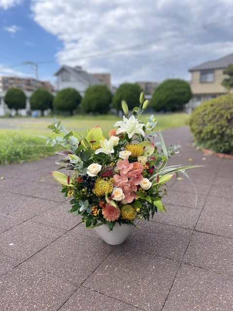 胡蝶蘭・八重のユリ・ピンクッション・薔薇と豪華なお花を沢山あしらってみました