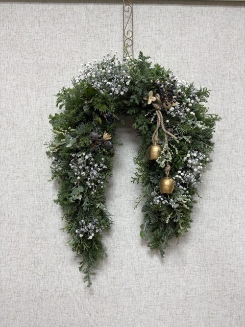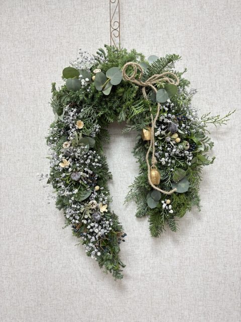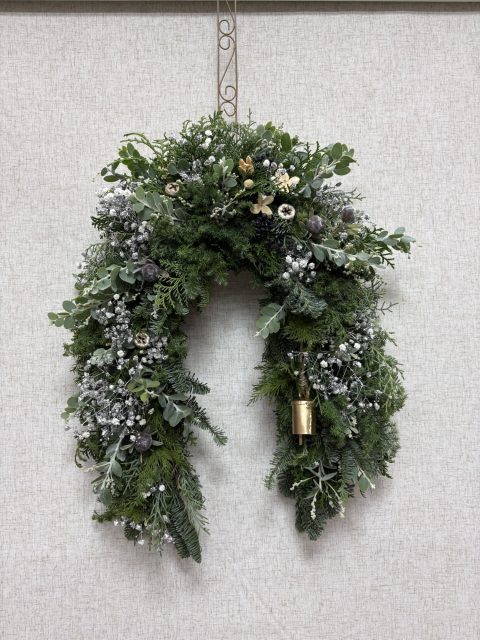 毎年どんな形のリースを作ろうかとその場で決められます。今年は馬蹄形に即決まりました